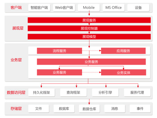 NC6產(chǎn)品的技術(shù)架構(gòu)采用分層體系結(jié)構(gòu),自下而上包括了存儲層、數(shù)據(jù)訪問層、業(yè)務(wù)層、展現(xiàn)層和客戶端。
